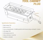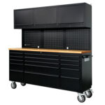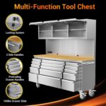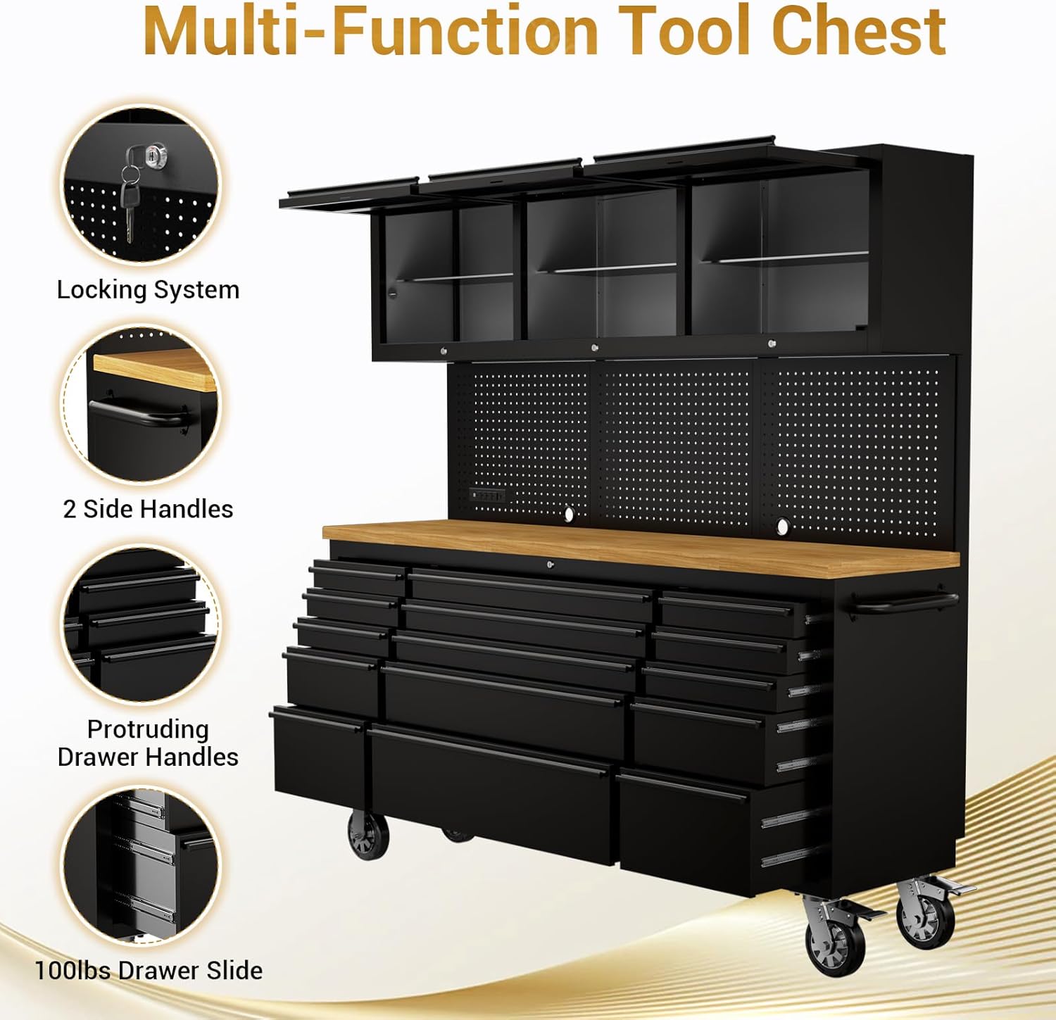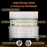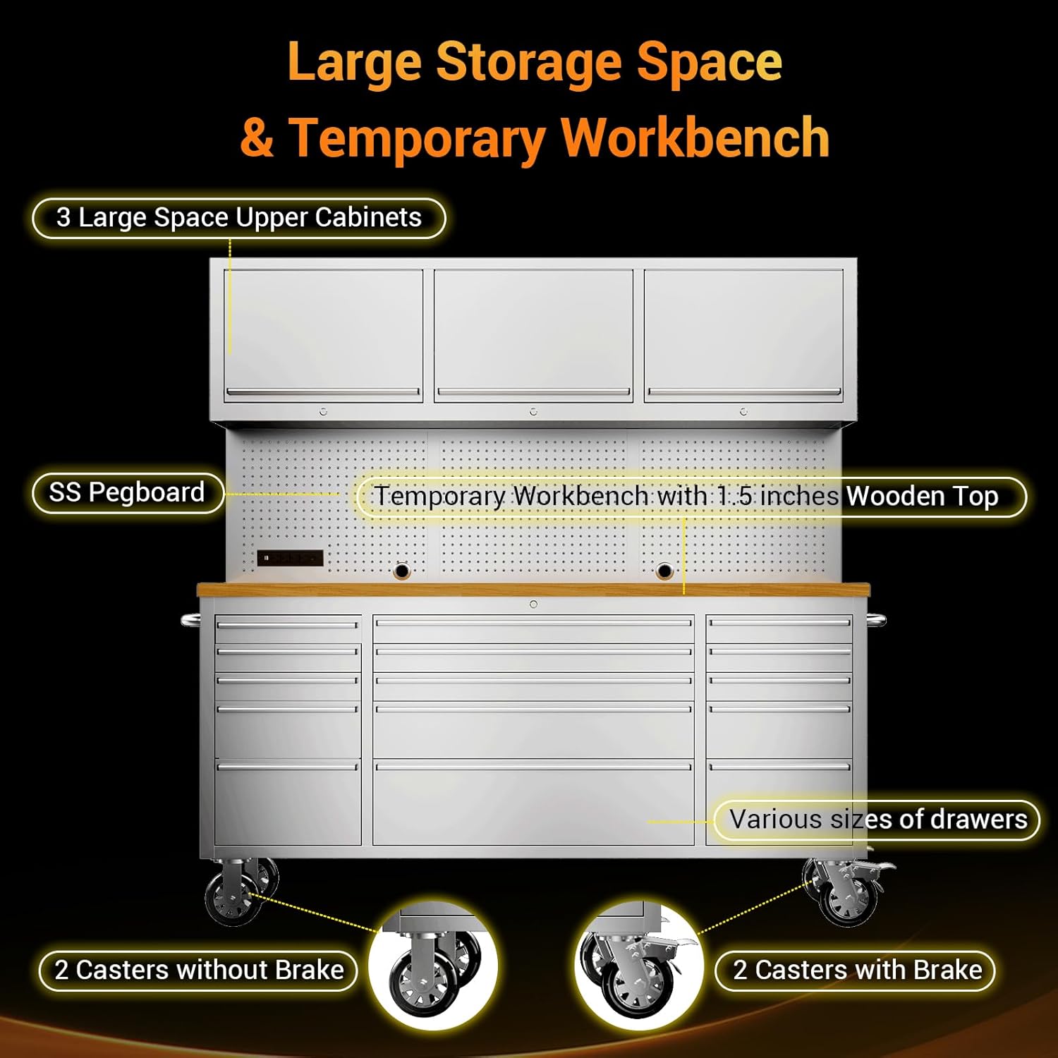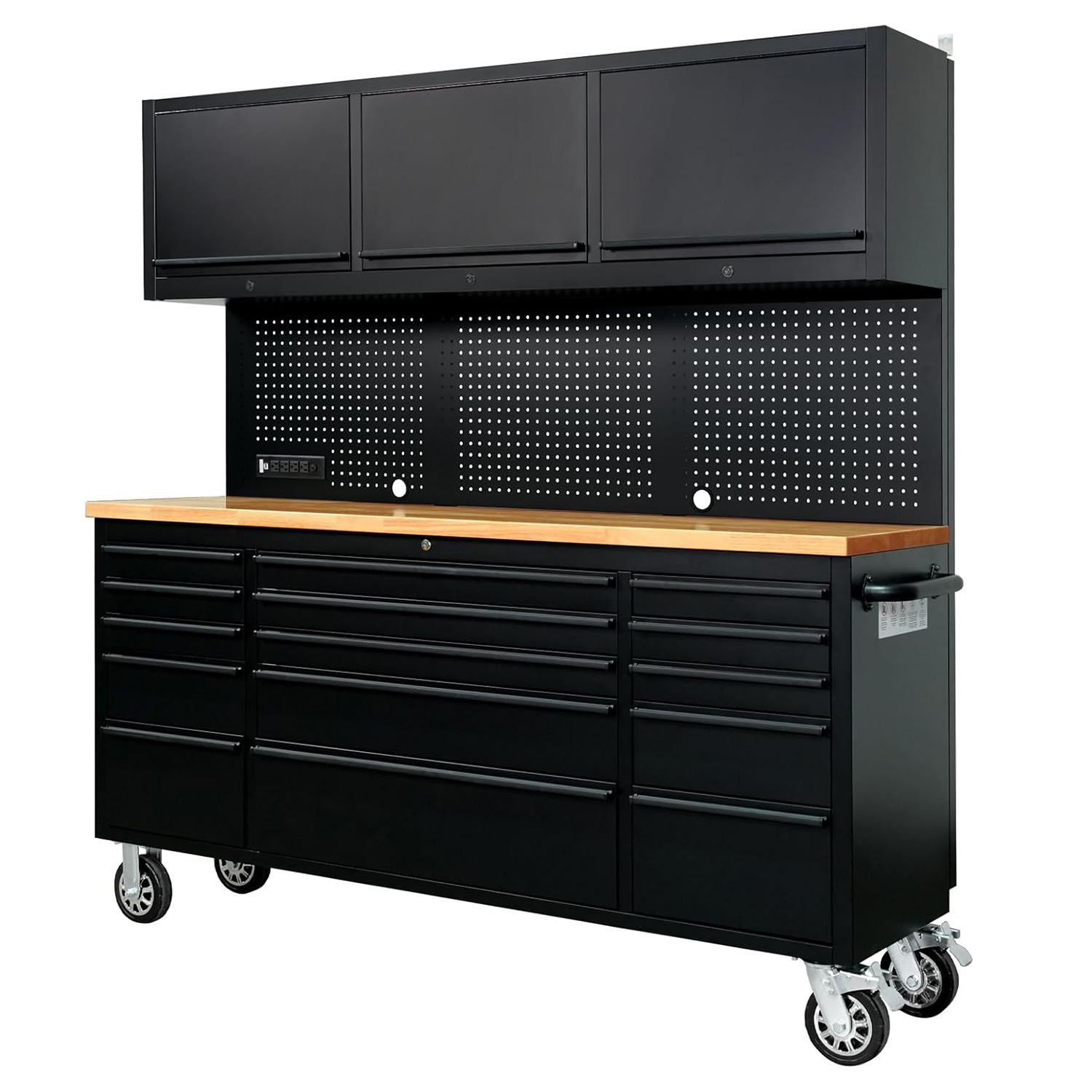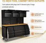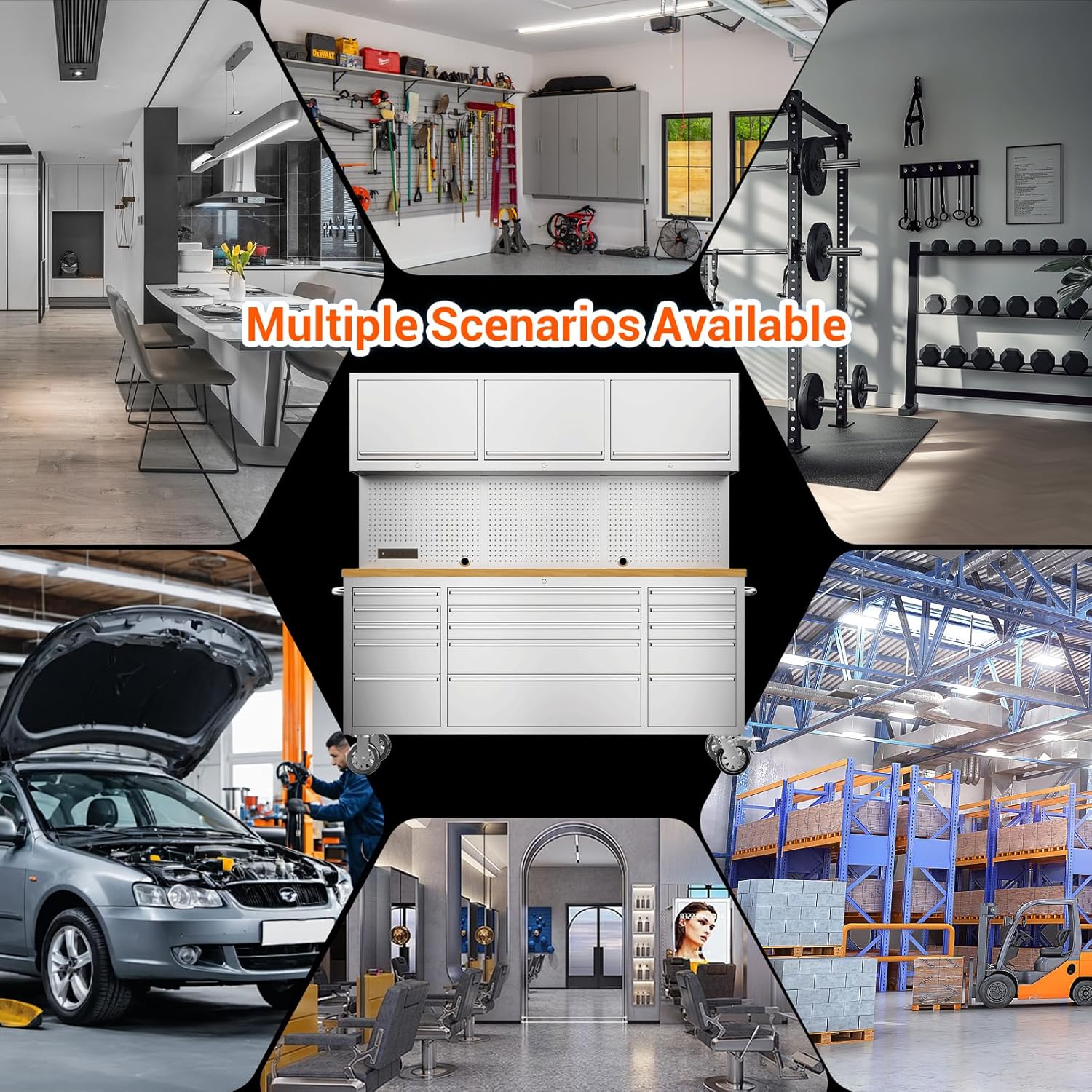 Professional 72′ heavy-duty steel workbench with 15 drawers (6 sizes), built-in 3-outlet power strip + 2 USB, SS pegboard for hanging tools, locking casters, and upper cabinet storage – the ultimate garage organization solution!